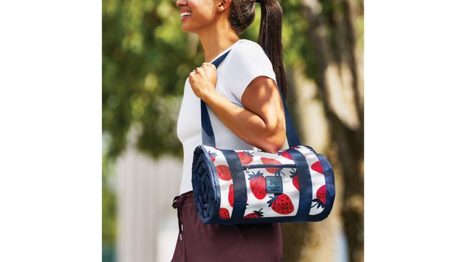 “It’s big enough for the whole family, and the water-resistant backing keeps you dry on grass or sand. I also love that it folds up with a strap, so you can just grab it and go,” she explained. “Plus, it comes in several different patterns!”