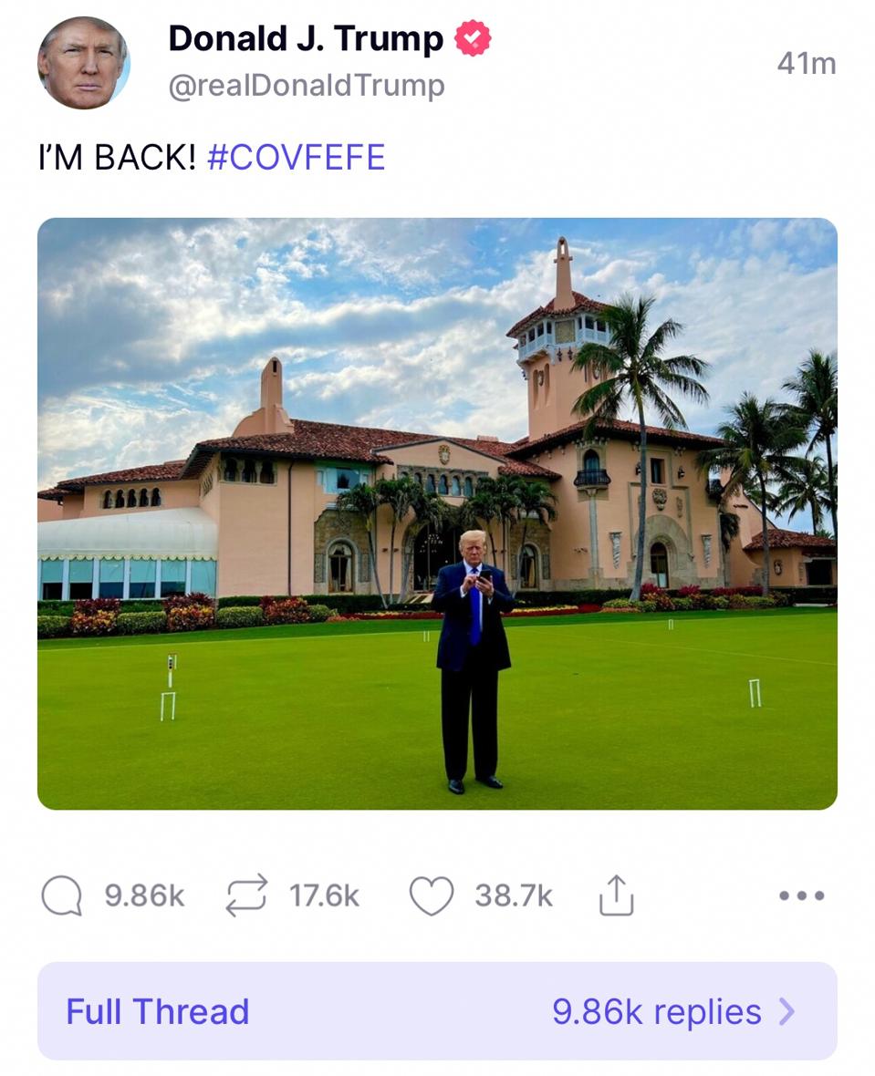 "I’M BACK! #COVFEFE," the post read, accompanied by a photo of Trump at his Mar-a-Lago club in Palm Beach, Florida.