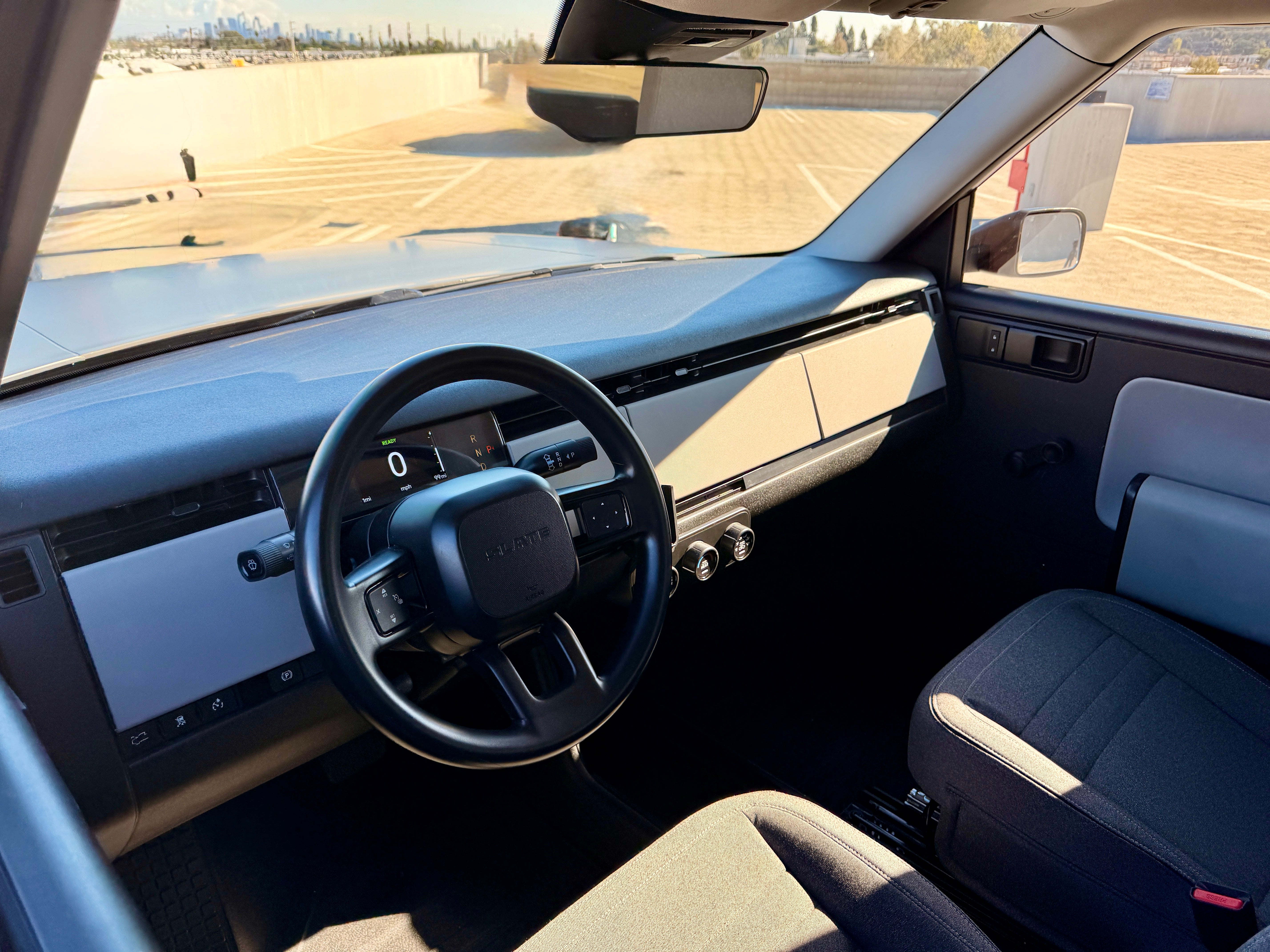 Unlike in the Cybertruck, there are stalks either side of the steering wheel. The one on the left takes care of lights, indicators and wipers; the one on the right is the gear selector. Other than three basic knobs for the heating and ventilation, and buttons to open the hood, for the stability control and speed limiter, plus an electronic parking brake, that’s it.