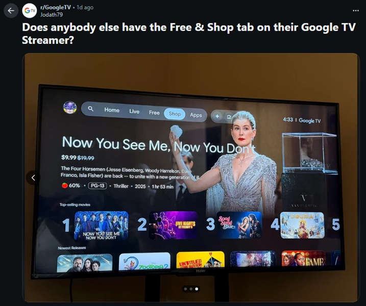 Other users chimed in, with one report for a user with a TCL stating they've received these new "Free" and "Shop" tabs on their set with Google TV built in. However, they state that the new home screen options are not present on their Chromecast with Google TV. Another user with a TCL reports the same additions.