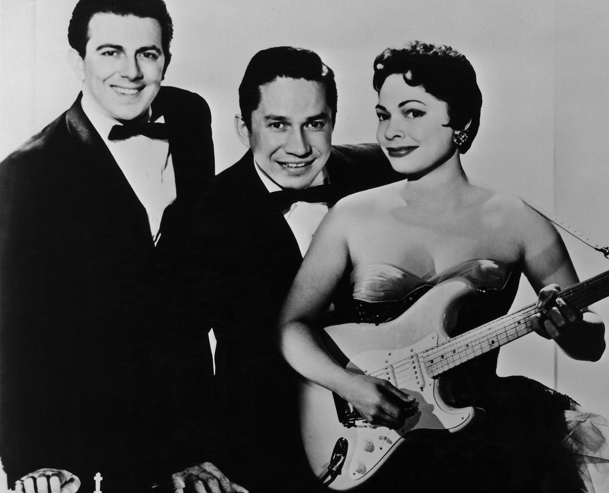 For its first six months, the guitar was kept in Don Randall’s office. During that period the guitar was photographed with Mary Kaye and her trio before an early 1956 performance at the Frontier Hotel in Las Vegas. As a publicity shot, the original backstage photo was somewhat less than ideal because the headstock was in shadow and the Fender logo was almost impossible to make out.