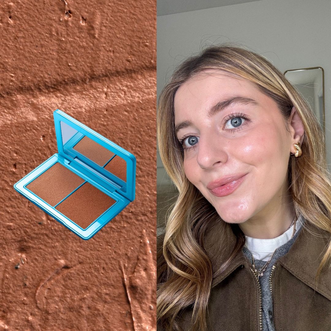 I have a feeling that a lot of people won’t use this the right way. Honestly, the formula is so creamy and easy to use that you can’t really mess it up, but there is a bit of strategy here. Don’t just muddy the two colors together. Instead, start with the darker shade in the duo and define and sculpt the areas you want to lift—almost like you would use a contour. I drag a little along my cheekbone, on the side of my nose, my jawline, and my hairline (but not too much here, as I have the world’s smallest forehead). Then, I use the lighter shade in the compact to diffuse any harsh lines and give my skin a healthy tan. I’m pretty generous with it, and it’s pretty impossible to mess it up. But just to err on the side of caution, I take my beauty blender, which has a little leftover foundation on it, and lightly bounce it over the edges.