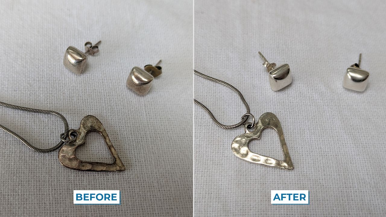 At the same time, I could see an instant difference in my earrings and pendant — they looked brighter. However, the chain, which I’d had problems cleaning before, still looked tarnished. I removed everything after five minutes, followed the instructions above, and then resubmerged the chain for a further 15 minutes.