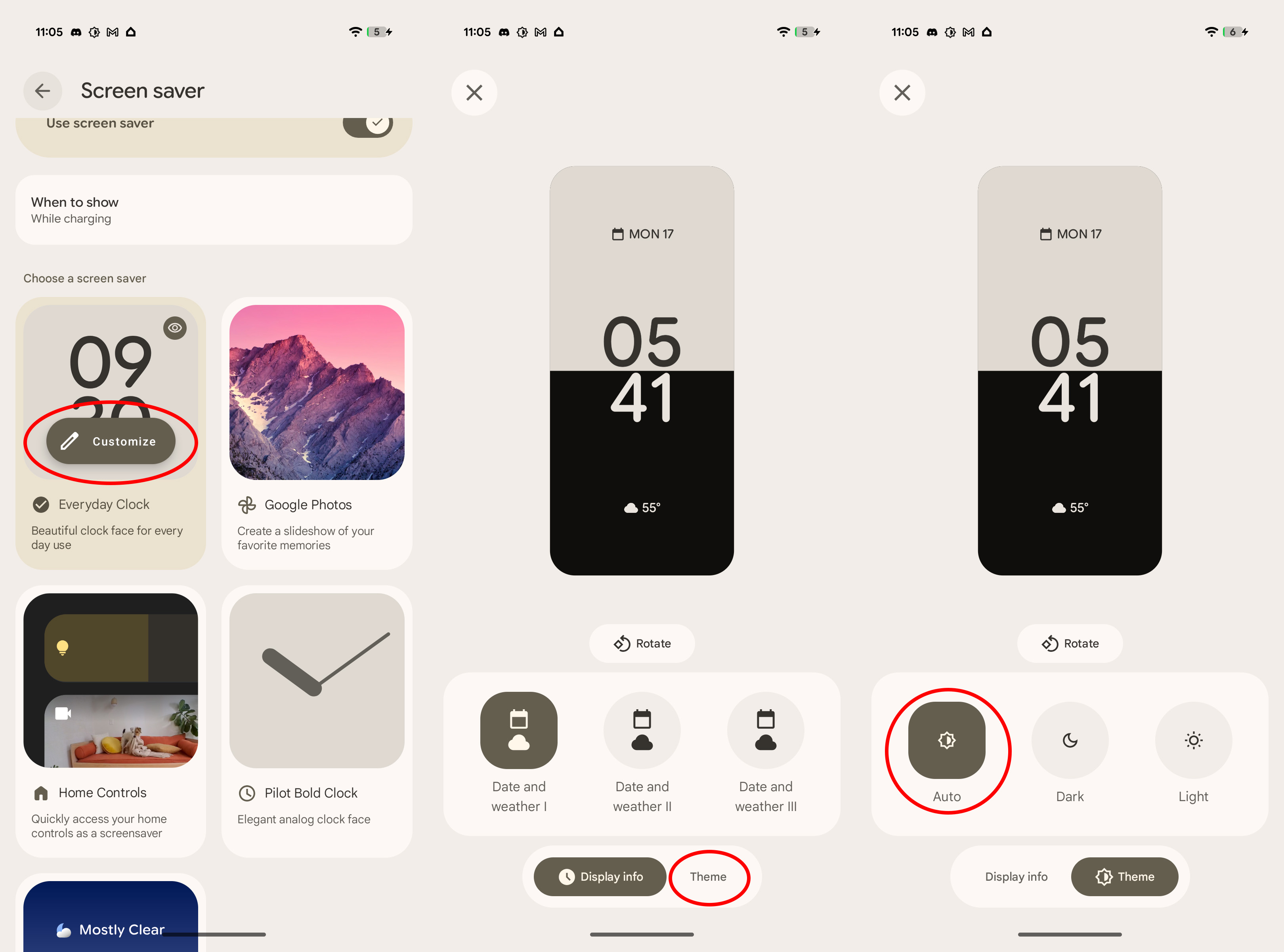 All of these options can be customized, including the theme to keep things extra dark at night. Once you've found the screen saver style you like, click the Customize button on the selected screen saver's tile. Then, you'll tap Theme at the bottom. I recommend selecting the Auto theme, as it'll automatically switch between light and dark depending on what your phone is using.