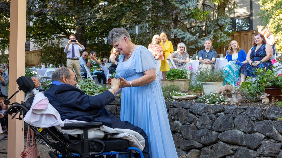 Jeanne Gustavson and Steve Watts on their wedding day in suburban Portland, Ore. | File photo.