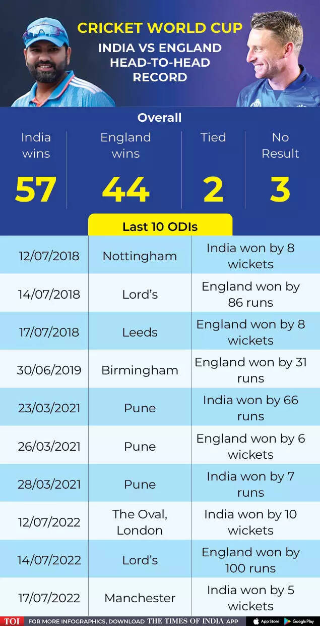 Here's India vs England head-to-head ODI record ahead of their World Cup group game at the Ekana Stadium in Lucknow on Sunday: