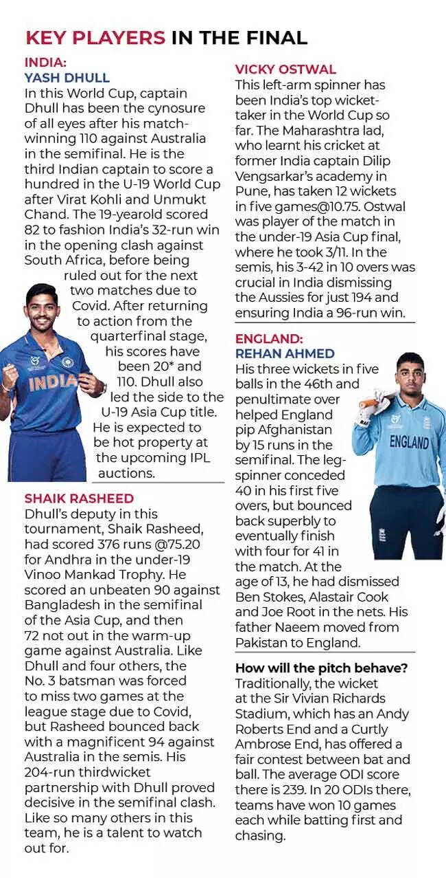 A win in the summit clash would help the India under-19s erase the memories of the last youth World Cup in South Africa in January 2020, when India lost an ill-tempered final to Bangladesh in South Africa. Unlike England, India have been a dominant force in in this tournament, having reached their eighth final — fourth in a row. No other team has reached as many finals or won more U-19 World Cups.