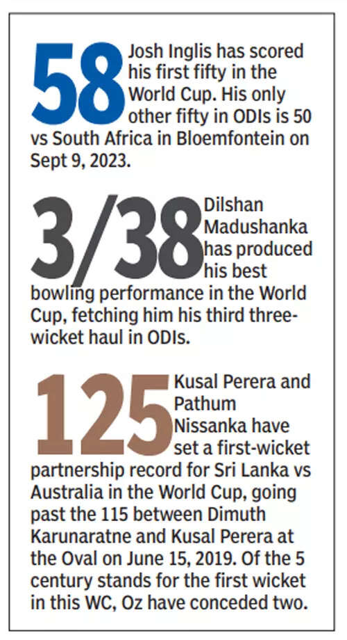 The win, made possible first by an inspired spell from Adam Zampa (4-47) and then solid batting performances by Josh Inglis and Mitchell Marsh, will take the Aussies two notches up to 8th position with one victory from three outings. The Lankans are at the ninth position with three defeats. They next play Pakistan on Friday.