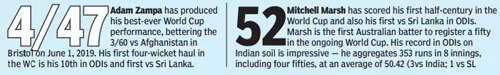 Thereafter, Zampa and Mitchell Starc got wickets in quick succession. Stand-in captain and leading batsman, Kusal Mendis fell cheaply for 9. From 157/2, wickets kept tumbling and Sri Lanka barely managed to cross the 200-run mark.