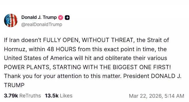 In a social media post, he wrote, "If Iran doesn’t fully open, without threat, the Strait of Hormuz, within 48 hours from this exact point in time, the United States of America will hit and obliterate their various power plants, starting with the biggest one first! Thank you for your attention to this matter."