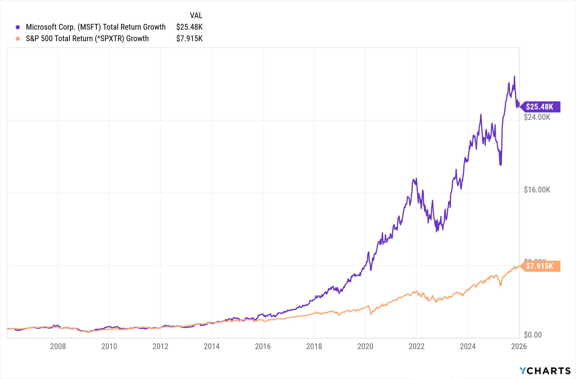 Have a look at the chart below and you'll see that if you put a grand into Microsoft stock two decades ago, it would be worth about $25,000 today. That's good for an annualized total return (price change plus dividends) of 17.6%.