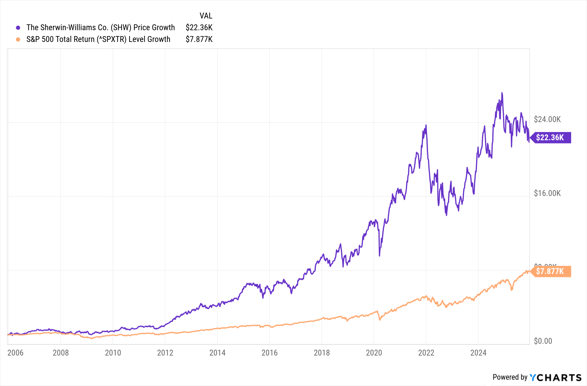 As you can see in the above chart, if you put $1,000 into SHW stock 20 years ago, it would today be worth more than $22,000. The same sum invested in the S&P 500 over the same span would theoretically be worth $7,900.