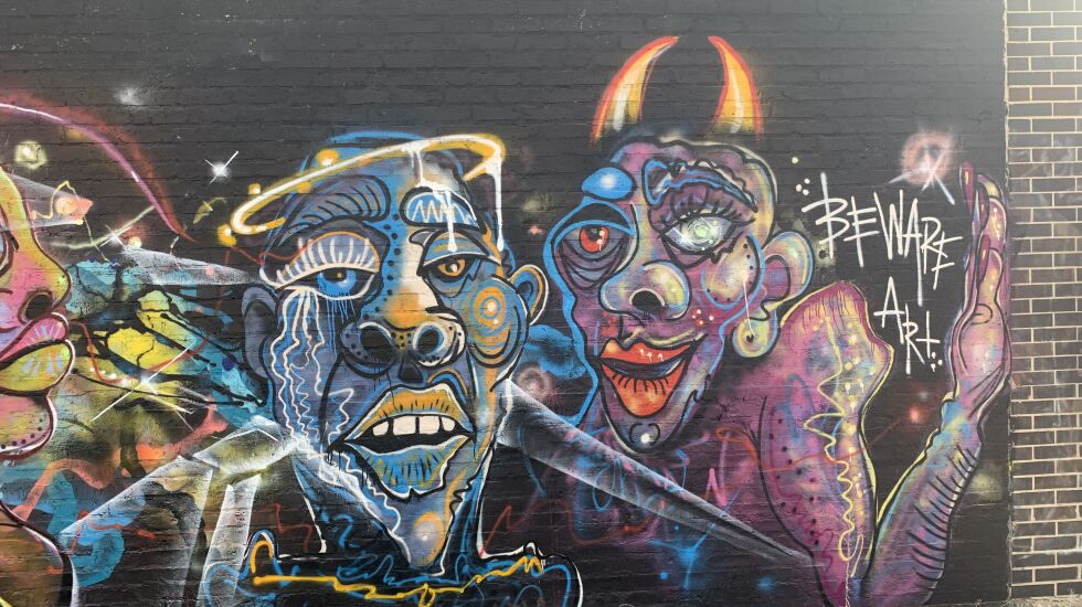 There’s something unsettling about the contorted faces painted on a brick wall of a building on Belmont Avenue just east of California Avenue.