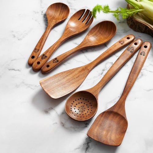 This six-piece set of wooden utensils comes with everything you need in the kitchen — a mixing spoon, serving spoon, salad fork, frying spatula, wok spatula, and slotted skimmer — so you’re covered for cooking, stirring, and serving. Made from natural teak wood, they’re sturdy, smooth, and easy to clean. Not to mention, they’re really pretty, too.
