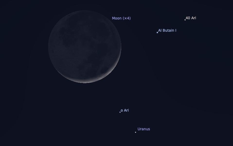 Look just below the lit crescent Moon and not 1º away you’ll find the blue-green dot of Uranus.