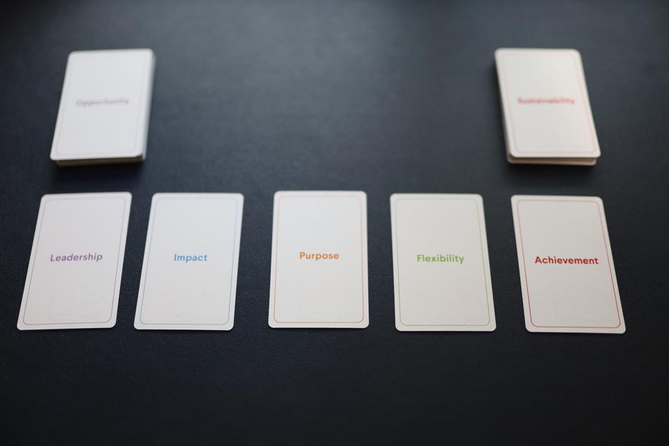 The procedure for sorting the cards goes as follows. An employee selects three cards from each of the five categories, shuffles the fifteen cards they have selected, then works through the selected cards once more to pick out their “Top Five Motivators.“ These are the cards you will invite the employee to talk about in a career conversation. The employee will use their cards to focus on such questions such as “Why do I do what I do? What’s most important? Where am I going in the future? How do I create a road map for my future career?” Careers are often messy, says Seamons, but some sense of direction can be useful to help a person move forward.