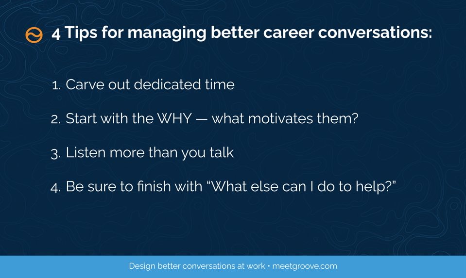 He sees this statement guiding his own life, as well as his work through Groove.com, the focus of this article. The Groove website claims “Career conversations help even the most inexperienced manager facilitate a discussion about someone’s career journey, that leads to positive outcomes for employees, teams, and companies.” The focus is on getting those managers to initiate and succeed in career conversations with their employees. “If we can do that,” says Seamons “we can have an amazing impact on people’s experience not just in their work, but in their lives.”