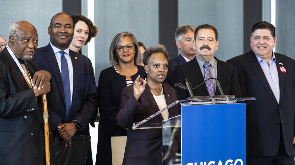 Harrison joined the DNC’s convention site selection team at a glitzy West Loop news conference, with the Willis Tower in full sight, Illinois Secretary of State Jesse White and his tumblers in tow, and Pritzker, Kelly and Chicago Mayor Lori Lightfoot making their pitch for the city to host the 2024 convention.