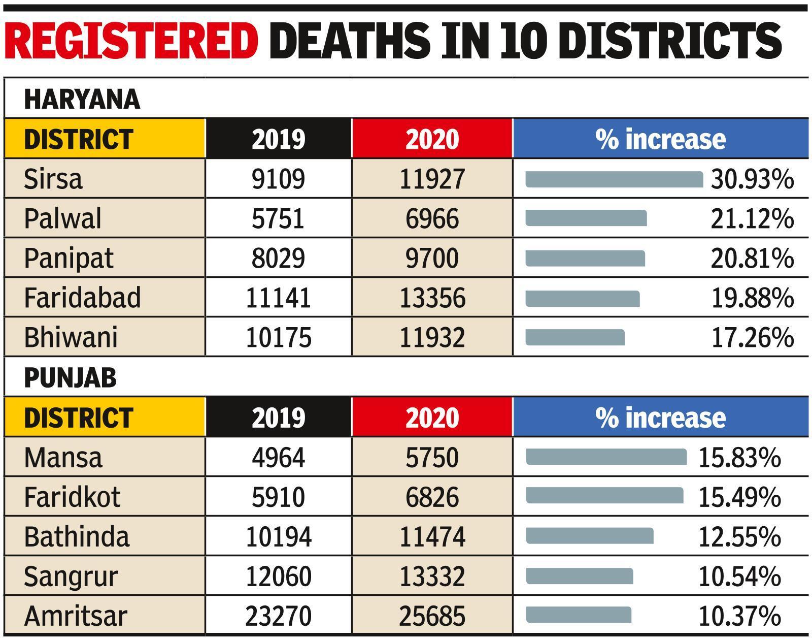 CHANDIGARH: Fifteen districts in Haryana and Punjab recorded a rise of over 10% in registered deaths by all causes in 2020, the year that saw the start of the Covid-19 pandemic.