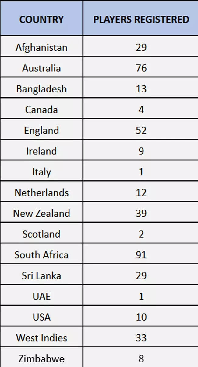 Among international players, South Africa has the most number of registrations -- 91 -- followed by Australia at 76.