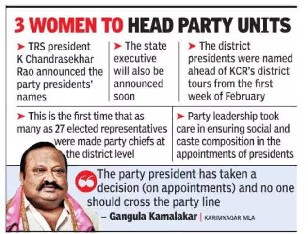 HYDERABAD: For the first time after formation of Telangana state, the ruling Telangana Rashtra Samithi appointed party presidents for all 33 districts. Among them, 19 MLAs, two MLCs, three ZP chairpersons and three MPs were chosen to head the party units at the district level.