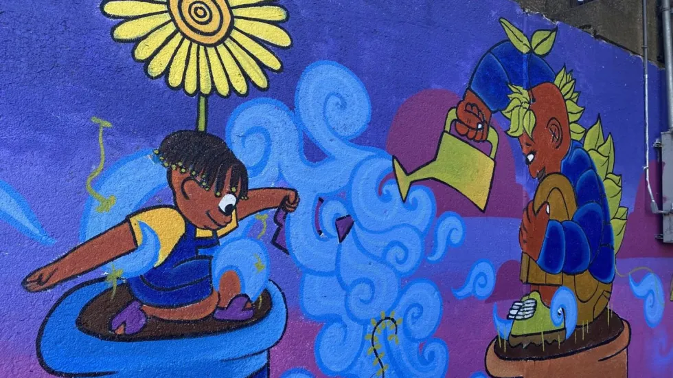 The mural shows people, as plants, at different ages. A seed? That’s a baby. A full-grown plant? An adult. There’s an in-between flower child, too.