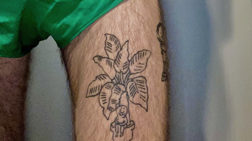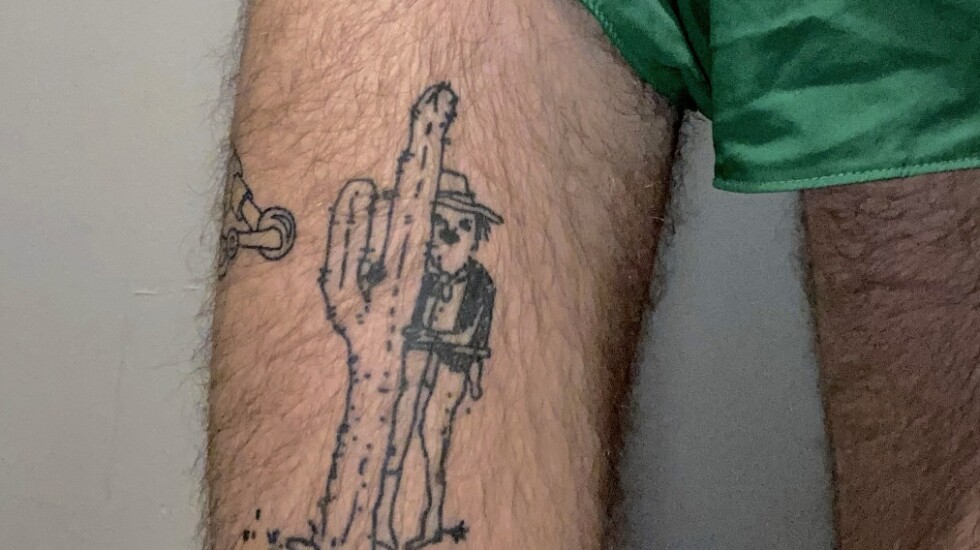 His first tattoo, a “shy cowboy” that peeks out from behind a cactus, was based on a drawing by a contemporary artist who goes by Pants.