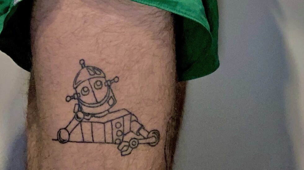 Most of Yokanovich’s other tattoos also were inspired by throwbacks. On his other thigh, a kind-looking robot tilts its head, ready to “listen and understand,” Yokanovich says.