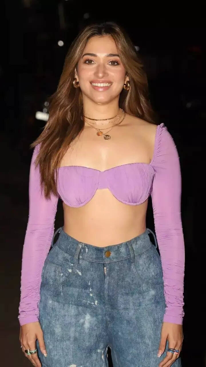 Keeping it casual yet snazzy at the same time, Tamannaah chose a purple crop top and denim pants.