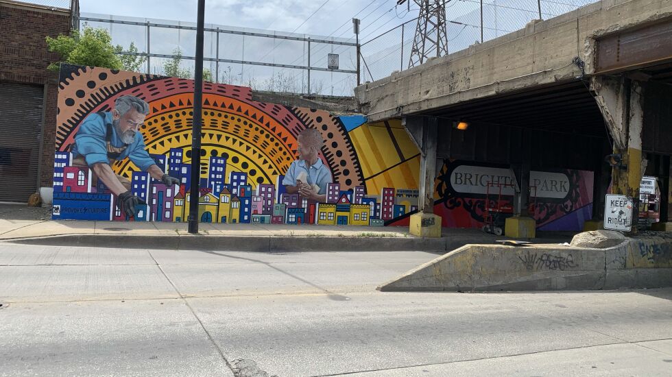 In August 2021, Maciel painted a mural near 47th Street and Archer Avenue in Brighton Park to “emphasize a rebuilding.” It shows a man and a boy working to build the neighborhood, the boy using toy blocks. The artist says it shows “the older teaching the young how to build and maintain” a community.
