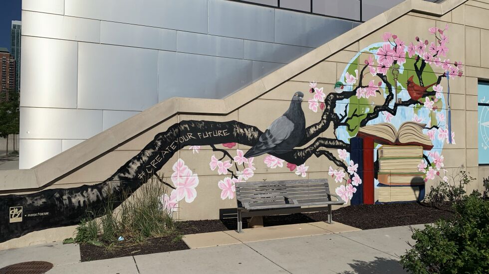 In June, Maciel completed a mural for the British International School of Chicago at 161 W. Ninth St. It includes three birds perched on the “tree of knowledge,” a pigeon to represent the city, a cardinal as Illinois’ state bird and another bird, a Puerto Rican tody, to represent the artist’s background. Maciel has Mexican and Puerto Rican heritage.