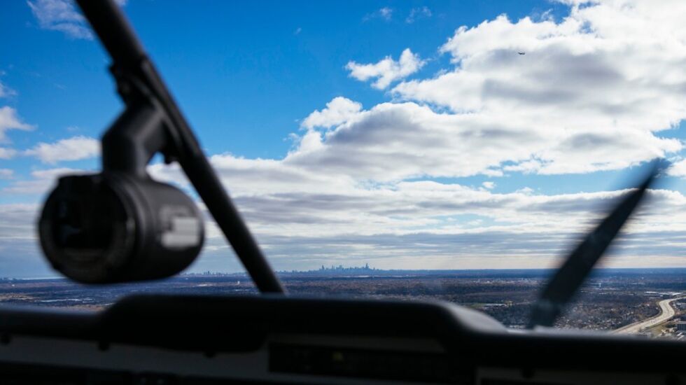 “That’s the Wisconsin border,” he says. “Doesn’t look like much from up here.”