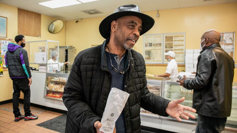 At the Caribbean American Baking Co., Leroy Viamille, a longtime Rogers Park resident, stops in after meeting with a real estate client, grabbing a late lunch of a vegetable pattie that costs less than $3.