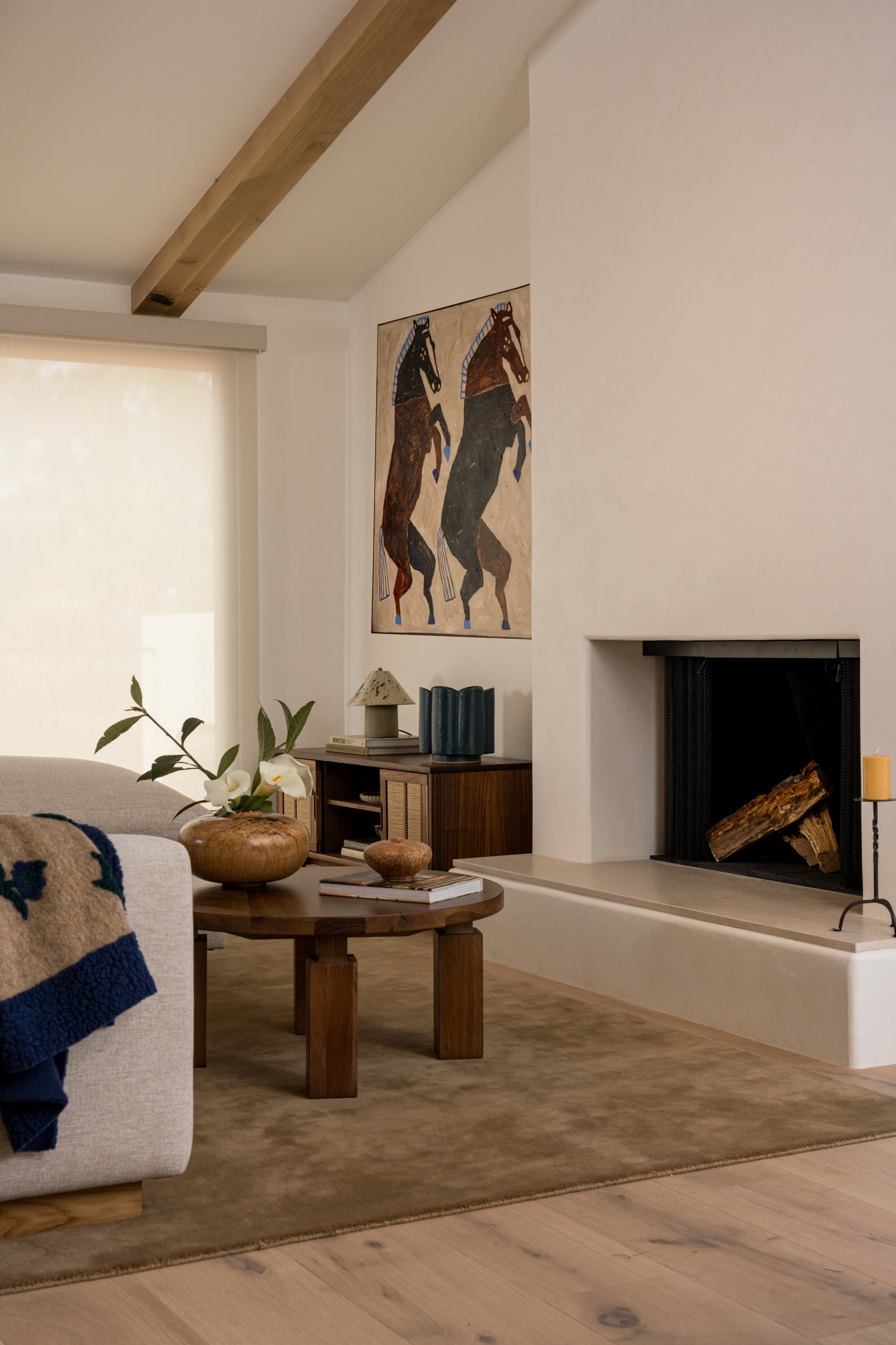 In the nook, Naber enhances the natural wood finish of the beams and engineered flooring with an original painting by Solomiya Zelenska and a distinctive Pinch pendant light, offering additional illumination for the family to enjoy casual meals.