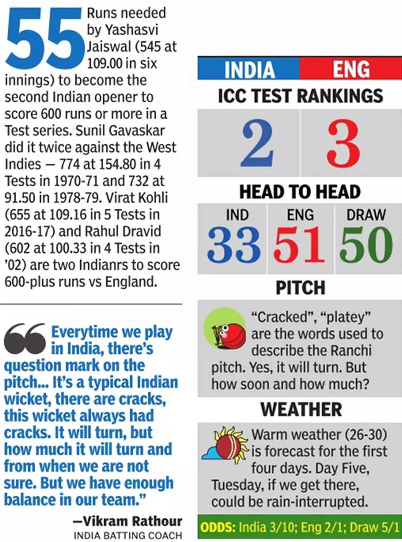 Only problem is, a two-faced wicket, if this is indeed one, could be a double-edged sword for India. They discovered in the first Test in Hyderabad that a turner would level the playing field and close the gulf in skillsets between the seasoned Indian spinners and the rookie English ones. India haven't reverted to type since and are 2-1 up heading into Ranchi, having won the previous Test by 434 runs on a rather benign Rajkot pitch.