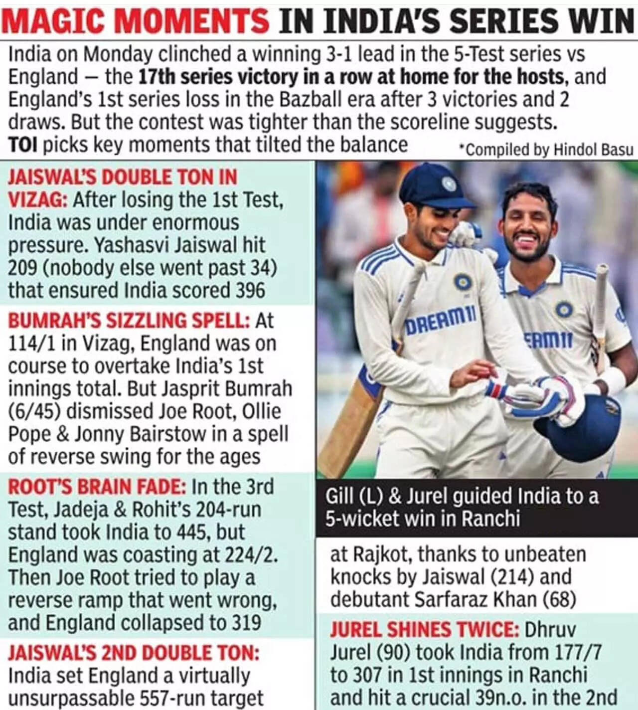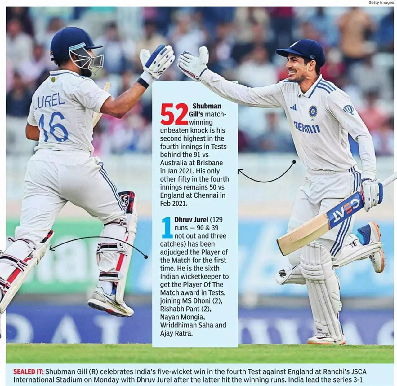 “When you’re playing on a wicket like this, you have to keep the cracks out of the game. If the ball hits the crack, you can’t do much. If it doesn’t, then it’s a good wicket to bat on,” Gill said. Jurel, Player of the Match after his 90 in the first innings turned the game, said, “Gill and I were having mid-pitch discussions on completing small tasks. We approached the chase in sets of only 10 runs each.”