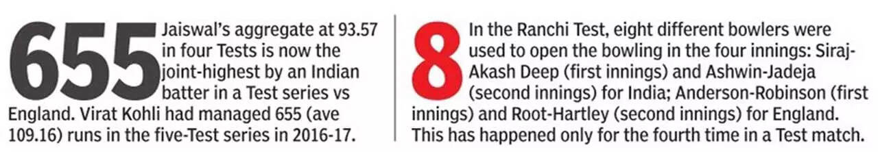 Yet, he needed support, and it wasn’t until first-innings hero Dhruv Jurel (39 not out off 77 balls; 2x4) arrived on the scene that the hushed stands heaved a sigh of relief. Jurel treated Bashir’s hat-trick ball with disdain, smashing it through cover for a rare boundary.