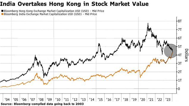 India’s stock market capitalization has overtaken Hong Kong’s for the first time as the South Asian nation’s growth prospects and policy reforms make it an investor darling while global capital pours out of China.