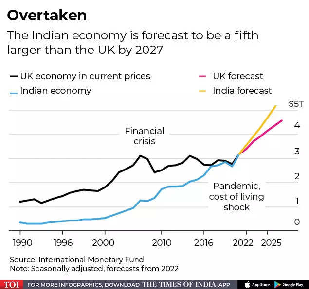 IMF’s own forecasts show India overtaking the UK in dollar terms on an annual basis this year, putting the Asian powerhouse behind just the US, China, Japan and Germany. A decade ago, India ranked 11th among the largest economies, while the UK was 5th.