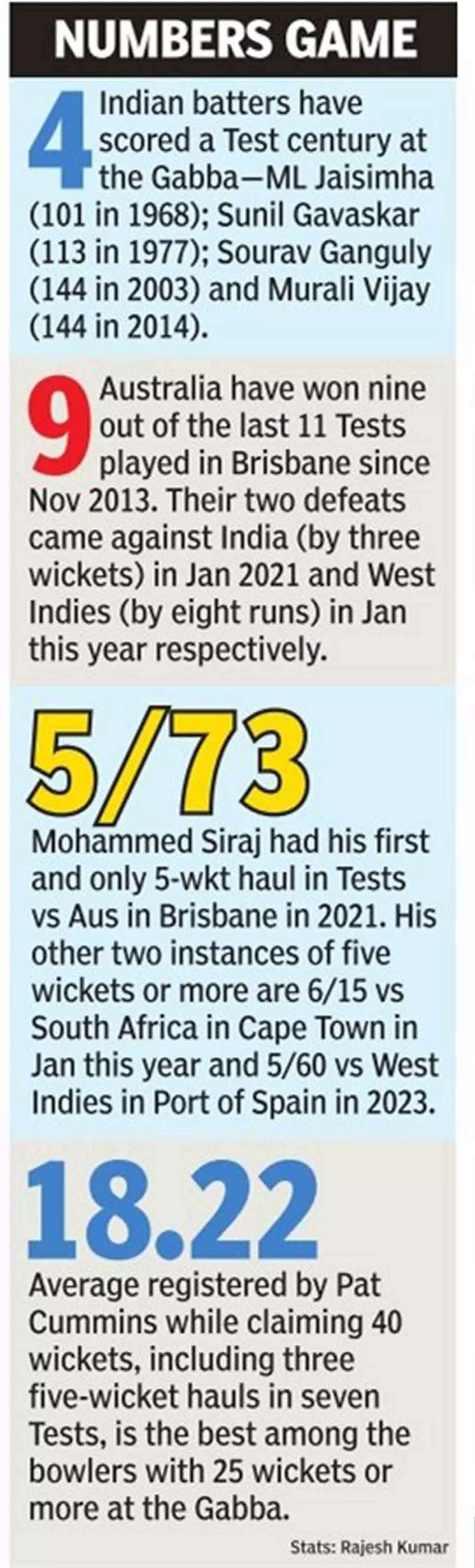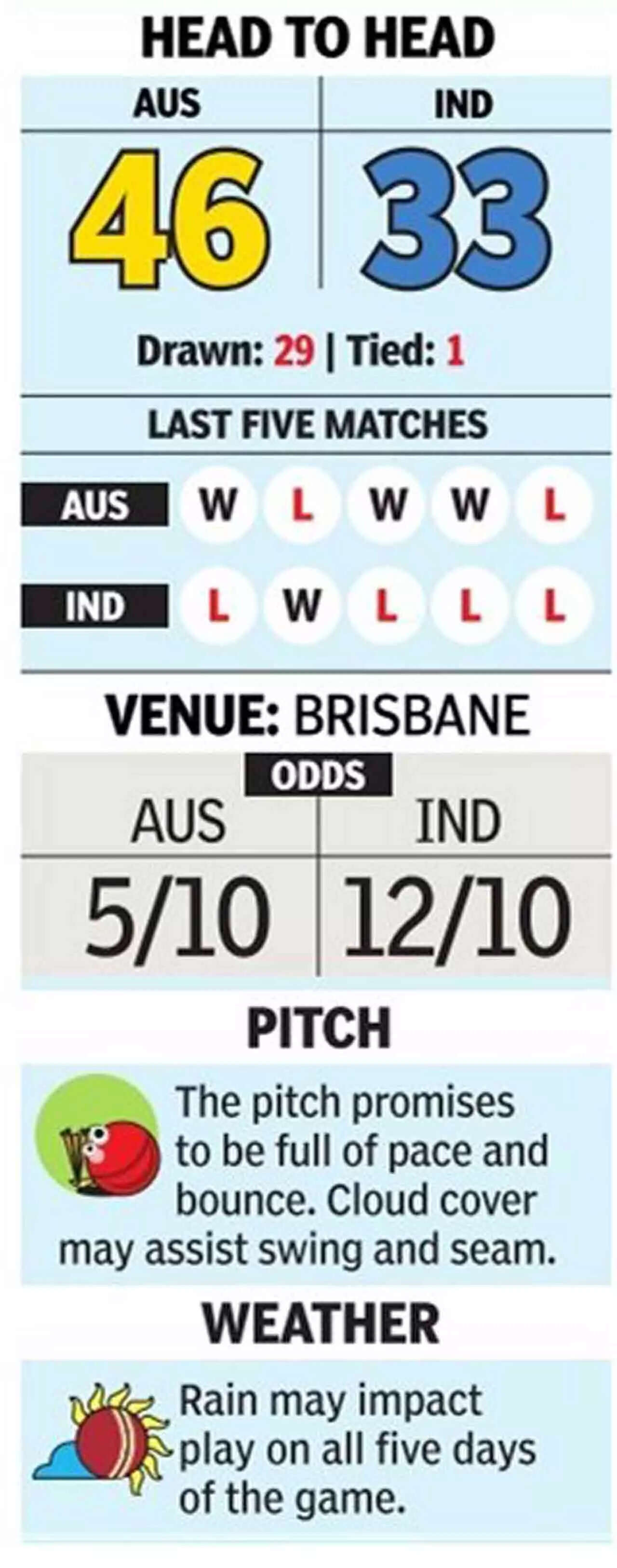 There will also be expectation that Virat Kohli, who scored a century in Perth when both the pressure and conditions had eased, can come up with a game-changing knock. Runs from the top four in both innings are crucial at the Gabba, and have tilted the scales for the winning side nine times in the last 10 Tests here.