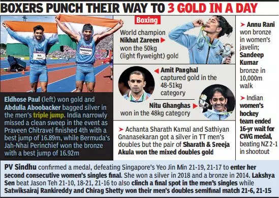 BIRMINGHAM: The Indian women's cricket team came heartbreakingly close to finally winning an elusive title, but imploded against Australia, world champs in both T20I and ODIs, to lose by 9 runs at Birmingham on Sunday. It was a disappointing end to an otherwise exhilarating day that witnessed three gold medals in boxing, a redemption bronze for the women's hockey team after 16 years of trying, and the unusual sight of three young men almost pulling off an unprecedented clean sweep of medals in the triple jump.