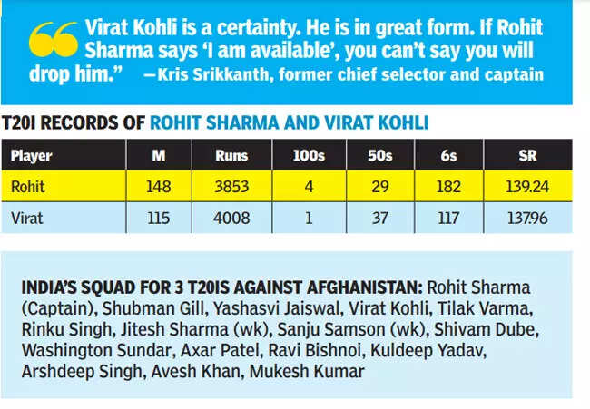NEW DELHI: For the first time in 14 months, Rohit Sharma and Virat Kohli are set to take the field in a T20I for India after the national selection committee named the two veterans in the team for the three-match home series against Afghanistan starting on January 11. The development comes at a time when the Indian team management is trying to settle on a core group of players for the T20 World Cup in June.