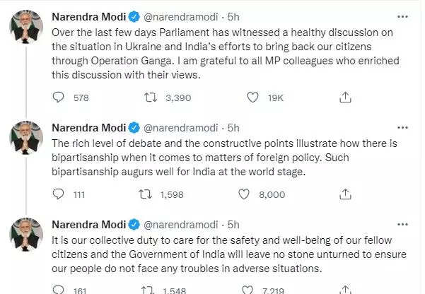 In his tweets, the PM also welcomed the appreciation from parliamentarians for Operation Ganga that the government launched for the evacuation of Indian students from Ukraine.“Over the last few days Parliament has witnessed a healthy discussion on the situation in Ukraine and India’s efforts to bring back our citizens through Operation Ganga. I am grateful to all MP colleagues who enriched this discussion with their views. It is our collective duty to care for the safety and well-being of our fellow citizens and the Government of India will leave no stone unturned to ensure our people do not face any troubles in adverse situations.”