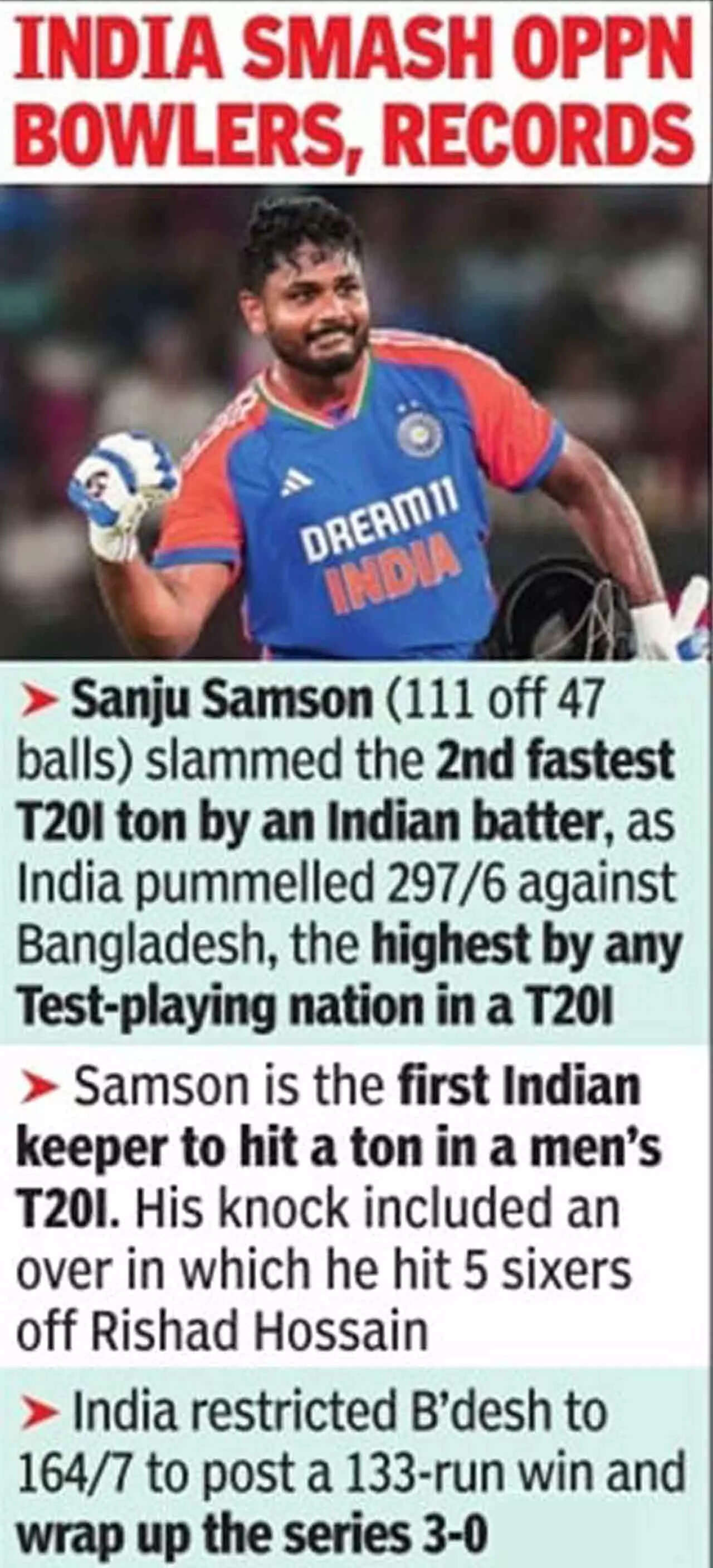 Samson's belligerent 111, SKY's 75 help India post 297/6 to set up 133-run win and sweep series 3-0 against Bangladesh