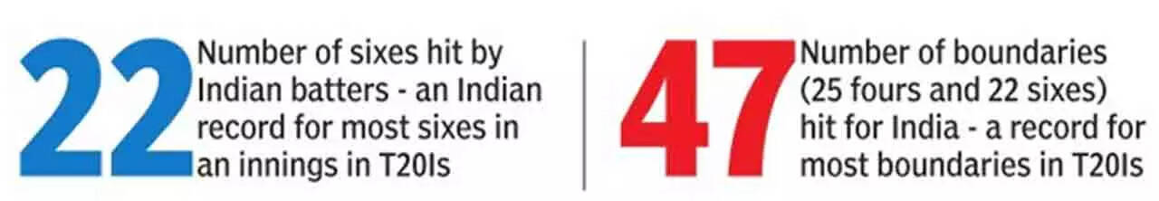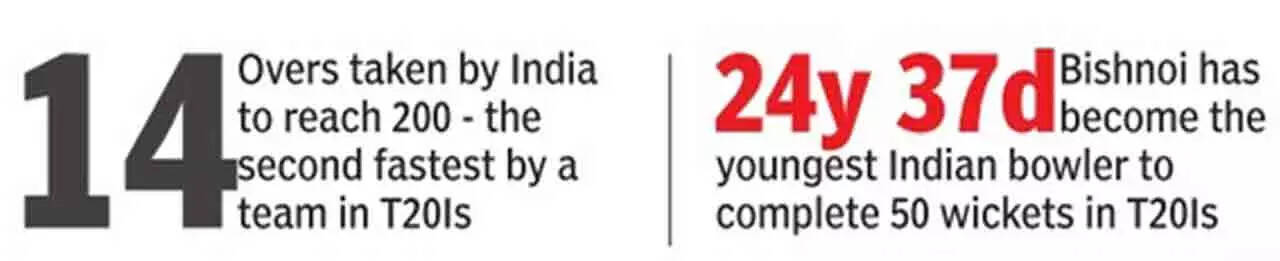 Skipper Suryakumar Yadav too got into the act and hammered 75 off 35 balls. The second-wicket partnership of 173 runs (70b) between the two made sure the Indian innings was on turbo mode right through after they decided to bat. While Samson hit eight sixes, Surya smashed five.