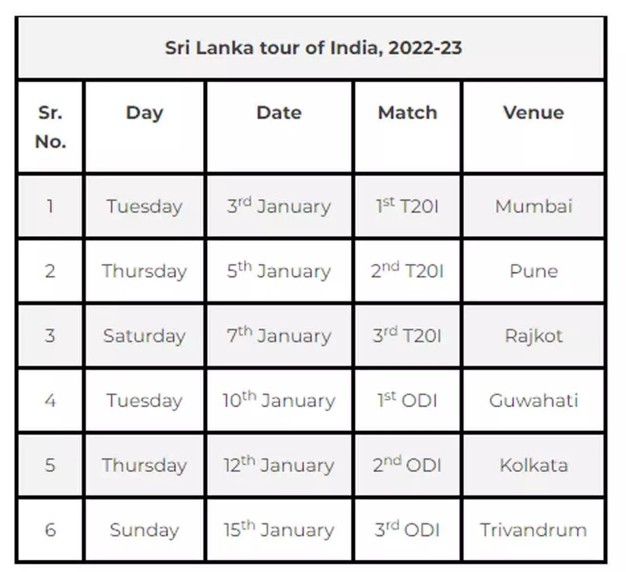 India and Sri Lanka will then play three ODIs on January 10, 12 and 15 at Guwahati, Kolkata, and Thiruvananthapuram respectively.