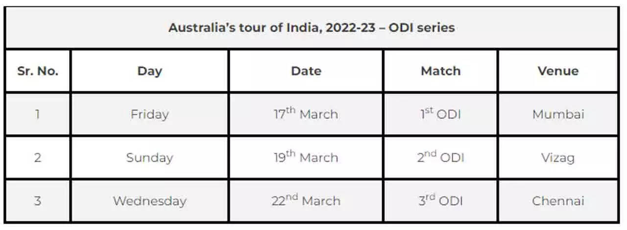 The home season will then conclude with a three-match ODI series between India and Australia that will be held in Mumbai (March 17), Vizag (March 19) and Chennai (March 22).