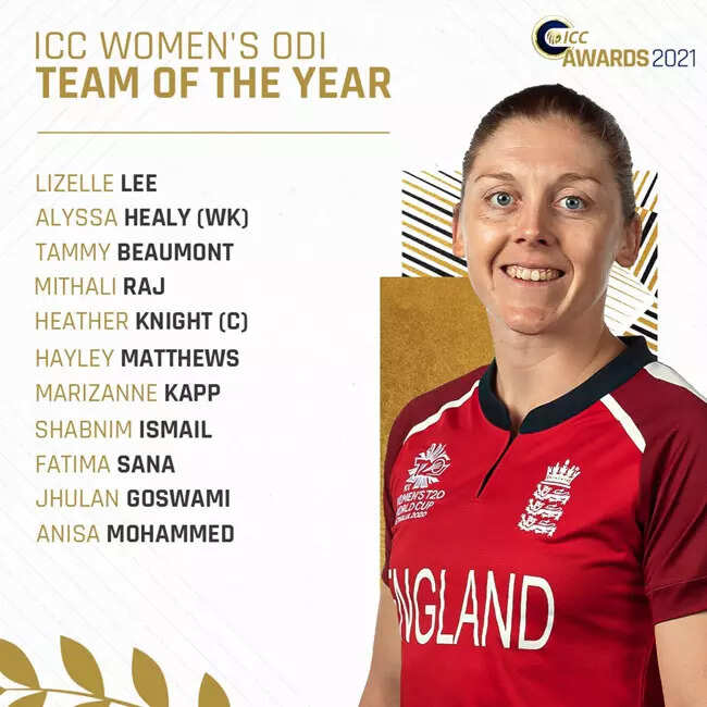 ICC Women's ODI Team of 2021: Lizelle Lee (South Africa), Alyssa Healy (Australia), Tammy Beaumont (England), Mithali Raj (India), Heather Knight (c, England), Hayley Matthews (West Indies), Marizanne Kapp (South Africa), Shabnim Ismail (South Africa), Fatima Sana (Pakistan), Jhulan Goswami (India), and Anisa Mohammed (West Indies)