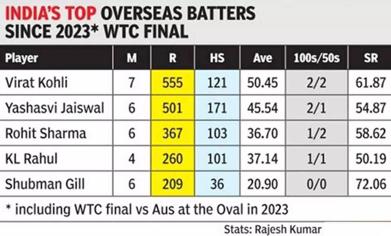Kohli, then, has to break new ground at the Gabba, but he's not the only one. In India's last five Tests, against Australia here and New Zealand at home, the whole top six has collectively averaged a poor 27.47. Take just the last seven overseas Tests, and their collective average rises to 35.39. In Australia so far, across the two Tests, the top six averages only 28.13 across 24 innings, in spite of centuries from Yashasvi Jaiswal and Kohli.