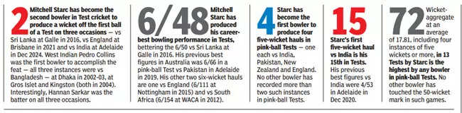 With that one ball, Starc demolished notions that this ageing Aussie team had gone ‘too soft’, or that it lacked the fight. Wasn’t it Jaiswal who told the veteran seamer in Perth that he was “coming too slow”? India pacers struggled to control the pink ball under lights.